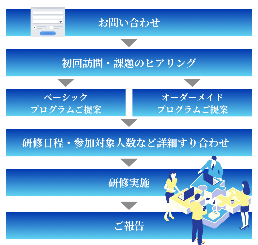 研修プログラムは、各企業の文化や課題に合わせてカスタマイズ対応です。