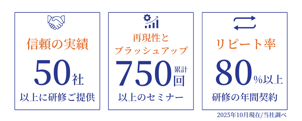 現在は、全国の企業・自治体・教育機関向けに「自分を成長させ、組織に貢献できる人財の育成」をテーマとした研修を年間100回以上提供しています。これまでに累計50社以上、750回を超える研修や講演を担当。高い定着率(継続依頼率80%超)と、成果に直結する研修スタイルでご評価をいただいております。