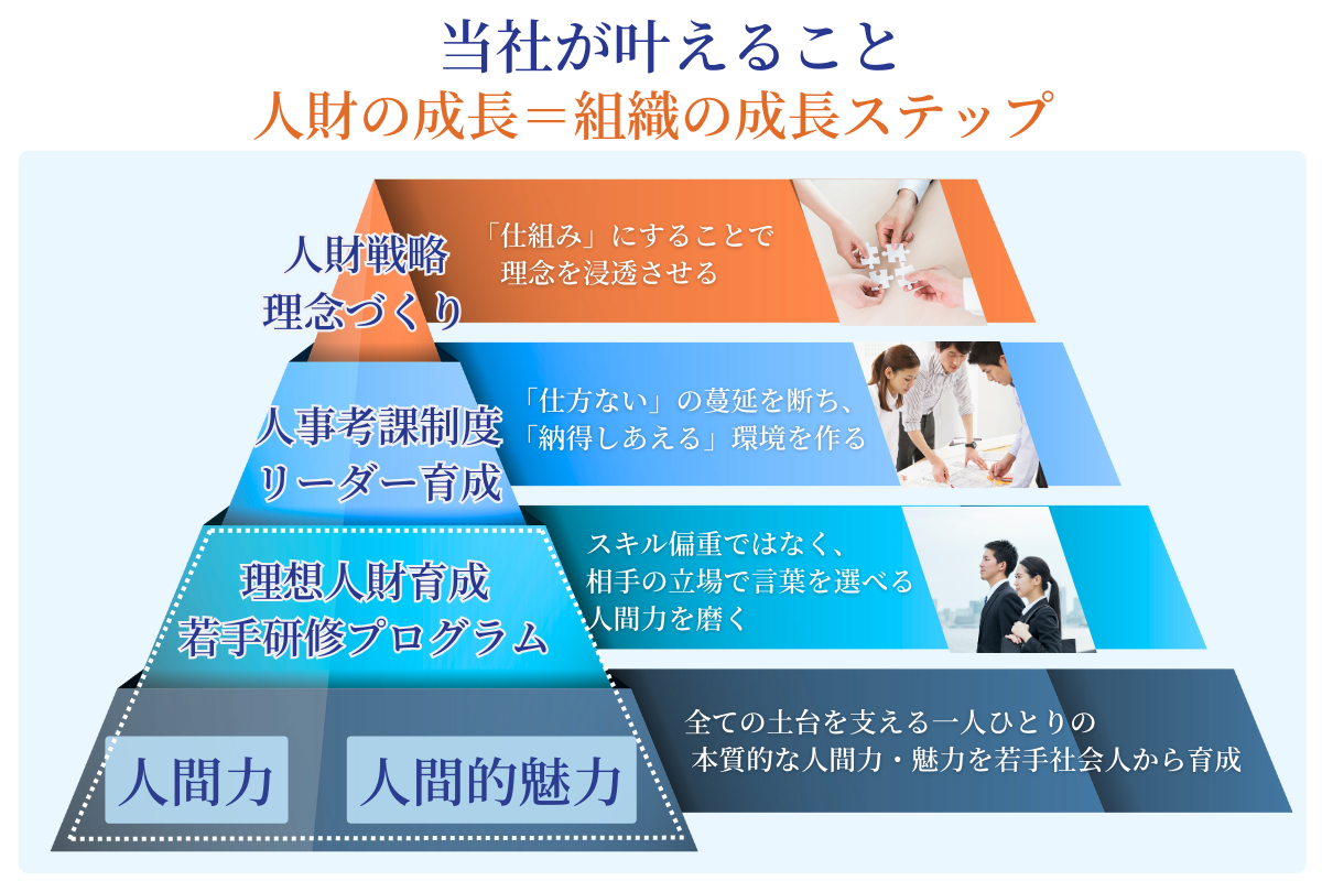 理念とはいわば、会社そのものの人間力。働く個人のあり方・目標と 会社の理念がリンクし、人財育成の隅々へと浸透していく。そんな成長のしくみを構築するご支援をします。